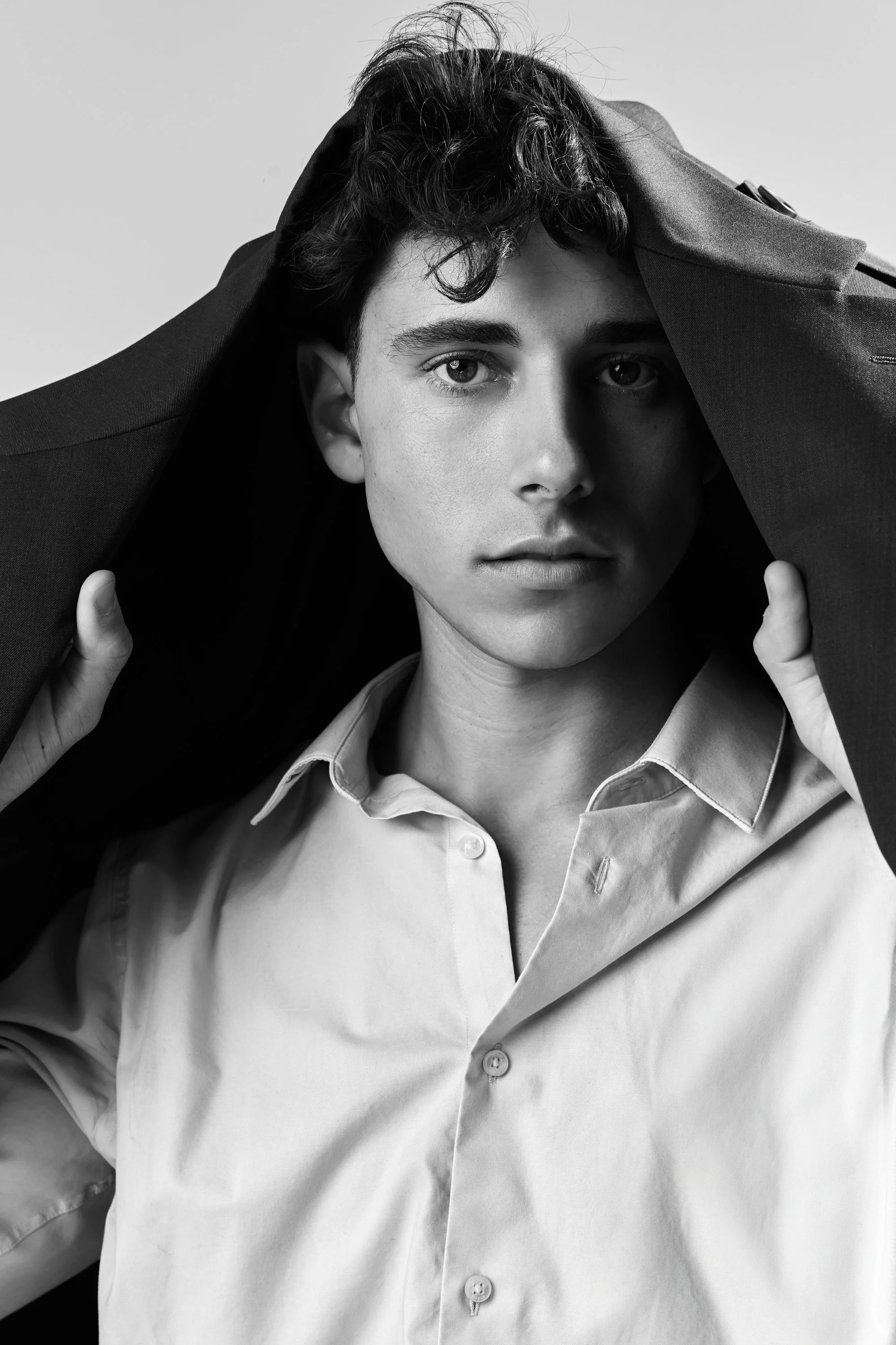 These questions—of self-doubt, transition, and self-discovery—are at the heart of this concept. The model's disheveled appearance—oversized clothing, shoes that don't quite fit, messy hair—becomes a visual metaphor for feeling fragmented, uncertain, and disconnected from the roles society expects of us. His ill-fitting shoes, both literal and figurative, speak to the growing pains of stepping into a new phase of life, and the discomfort of transitioning from who we are to who we want to be and the pull to want to hide.